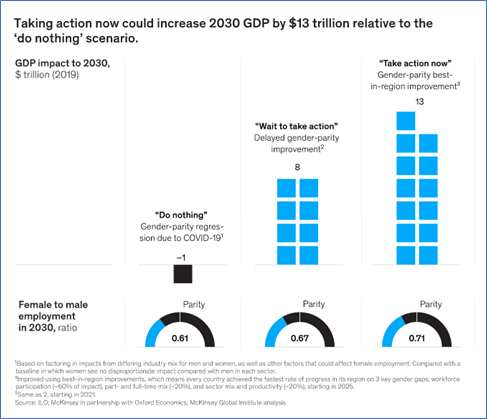 Deeper research shows that women may be in a position now, more than ever, to address these persistent issues. This crisis behind the health crisis is gaining national and international attention. In recent years, research has exhibited that women in the demographics known as millennials, are being faced with unexpected issues in the workplace that their former female professional (elders) may not have been able to address. One of which is the pay gap. Although working 9-to-5 (with a Dolly Parton tune playing in the background) was a feat unto itself, gender parity, as it is known, is the challenge of the moment. States and some federal laws have taken some high roads towards labor laws, but there still is a glaring difference in how a women is paid in the same role if filled by a man. In fact, Mckinsey has reported that if we “Act Now” on gender parity, GDP could increase by $13 trillion in 2030.